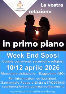 IN PRIMO PIANO Esercizi spirituali per sposi alle Piane di Mocogno 21 – 22 marzo 2026 ALTRE NOTIZIE Ritiro spirituale per Catecumeni con il Vescovo Erio 21 febbraio 2026 Veglia di S. Valentino 2026 – per tutte le coppie di Sposi e Fidanzati Itinerari in preparazione al matrimonio del Vicariato Modena-Nonantola – calendario 2026 Itinerari interdiocesani in preparazione al matrimonio – calendario 2026 Percorso di fede per giovani sposi 2025-2026 Itinerario Diocesano di Fede in preparazione al Matrimonio ARCHIVIO NOTIZIEALTRI EVENTI La chiamata di Dio per la nostra coppia – aprile 2026 Weekend Sposi 10-12 aprile 2026 ALTRI EVENTIDOCUMENTI E PUBBLICAZIONI Esortazione apostolica “Amoris Laetitia” Lettera del Santo Padre agli Sposi Lettera Eciclica “Fratelli Tutti” Lettera Enciclica Laudato si’ di Papa Francesco ARCHIVIO DOCUMENTI E PUBBLICAZIONIEDUCHIAMO L'AFFETTIVITÀ Il coraggio di educare. Approfondimento con Daniele Novara “Quando si ama?” e “Educhiamo l’affettività” 2023 ARCHIVIO EDUCHIAMOCONTATTI Ufficio Interdiocesano di Pastorale Familiare Via S. Eufemia, 13 - 41121 Modena Tel. 059.2133845 Email: cdpfam@modena.chiesacattolica.it Direttore: TREVISAN Don Maurizio Per chiedere conferma in merito alla realizzazione delle varie proposte o per iscrivervi alla newsletter, contattateci ai nostri riferimenti. ARCIDIOCESI DI MODENA-NONANTOLA“Cristo è la nostra pace” disarmata e disarmante – Lettera pastorale 2025-2026Annuncio Giornata Mondiale delle Famiglie https://youtu.be/nZU6uxChL3oMeditazioni in Cammino verso la Pasquahttps://youtu.be/_YgXUrl5OAYMessaggio del Vescovo Erio agli amici dell’Ufficio Famigliahttps://youtu.be/PwjCQ1DnuuEcentro di consulenza per la famigliaGiornata della Vita NascenteRETROUVAILLE Calendario Appuntamenti LITURGIA DEL GIORNO